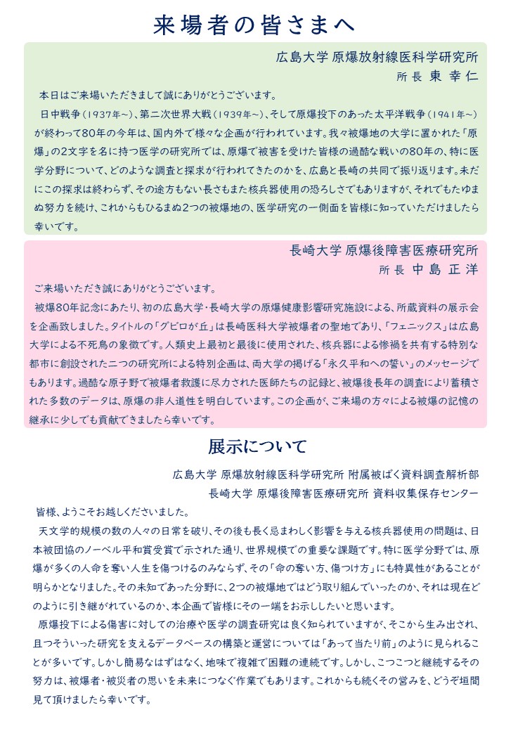 原爆被災から80年を記念し、両研究所の取り組みの一端をここにご紹介し、さらなるご理解とご支援を賜りたいと存じます。