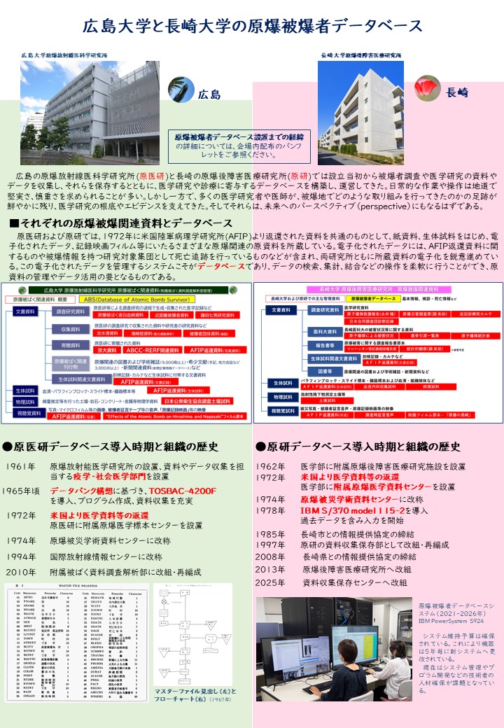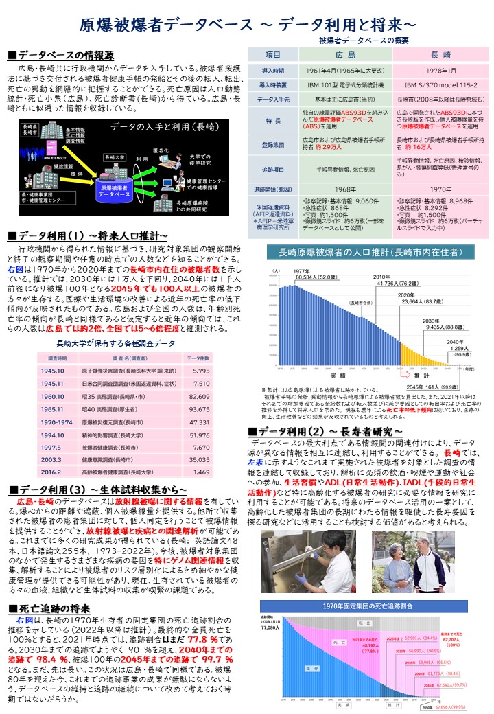 広島大学原爆放射線医科学研究所および長崎大学原爆後障害医療研究所は、共に原爆被爆者に対する救護や調査に関する資料の永続的な保存を目指して活動しています。同時に原爆後障害研究の礎となる学術情報データベースとして、行政機関を通じ、被爆者の皆さま方の情報をお預かりしさまざまな情報を連結し研究に活用させていただいています。