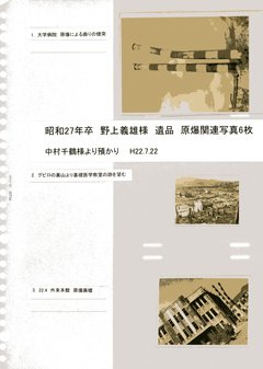 | 大村海軍病院、院長 泰山弘道による原稿用紙427枚の原稿。1951年8月9日脱稿。大村海軍病院での重症患者の写真と内容が記録されている。758名の原爆患者が収容され、惨状を目撃した著者が実相を克明に記録、アメリカの原子研究班、長崎医科大学の復興などについて記録されている。「長崎が最後の被爆地であるように」との願いが込められている。 |