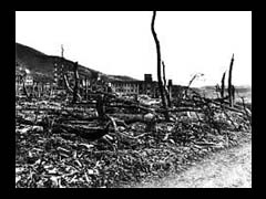 中央左が県立盲唖学校、中央のレンガ造りは浦上天主堂と復興した仮聖堂、右に点在する白い建物は長崎医科大学 |