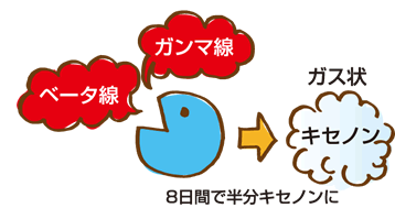 放射性物質は不安定な構造をしており、安定な物質になろうとする過程の中で放射線を出します。例えば放射性ヨウ素の一つである「ヨウ素131」はベータ線、ガンマ線などの放射線を出し、最終的には「キセノン」という物質に変わります。キセノンはガス状の物質で、もう放射線を出すことはありません。半減期が約8日のヨウ素131は、放射線を出しながら約8日間で半分がキセノンに変わります。つまり半減期は放射性物質が放射線を出し、安定な物質になるまでにかかる時間ということができます。 これを「物理学的半減期」と言います。事故から1年以上がたち、県内で放射性ヨウ素が検出されることはありません。