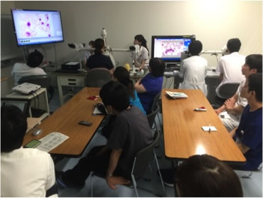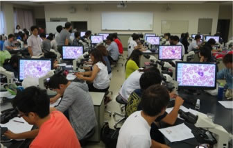 3年生の血液・リンパ系の顕微鏡実習を行いました。血球に関する講義のあと、モニターで例示しながら、末梢血塗抹標本を観察し血球のスケッチをしてもらいました。来週は骨髄の塗抹標本のスケッチです。