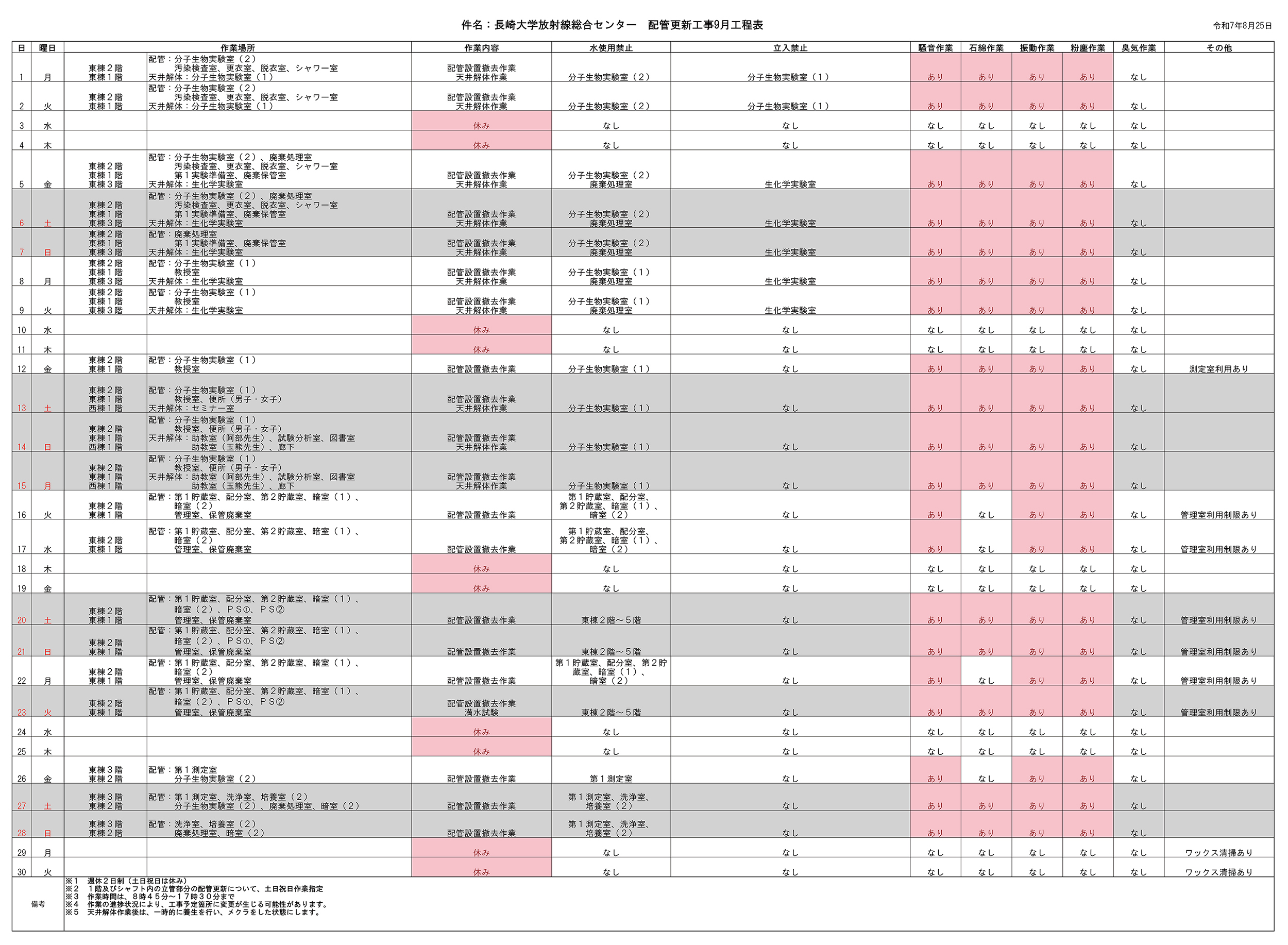 当施設の排水管更新工事においてご迷惑をおかけしております。9月の工事日程のご案内です。