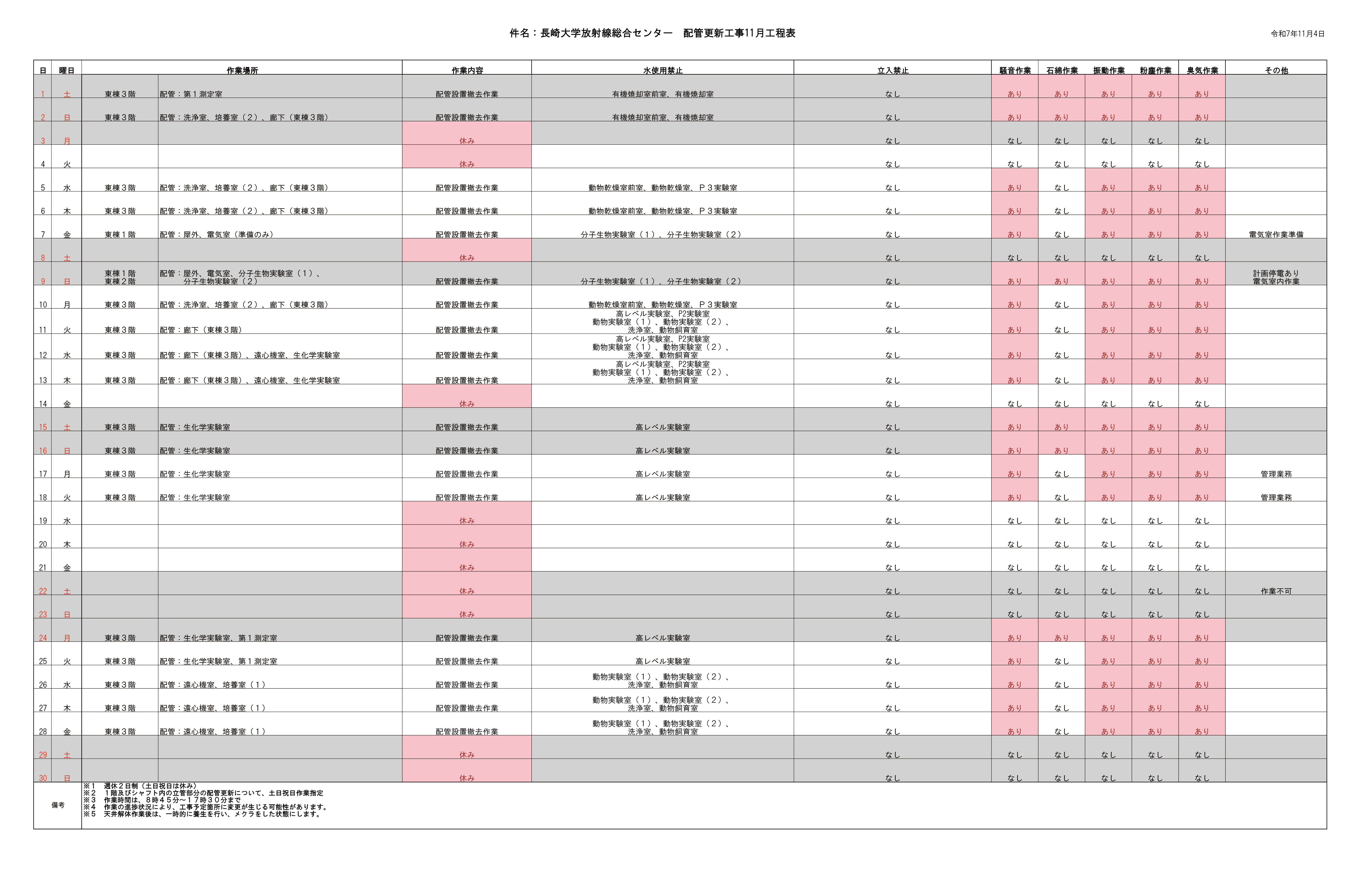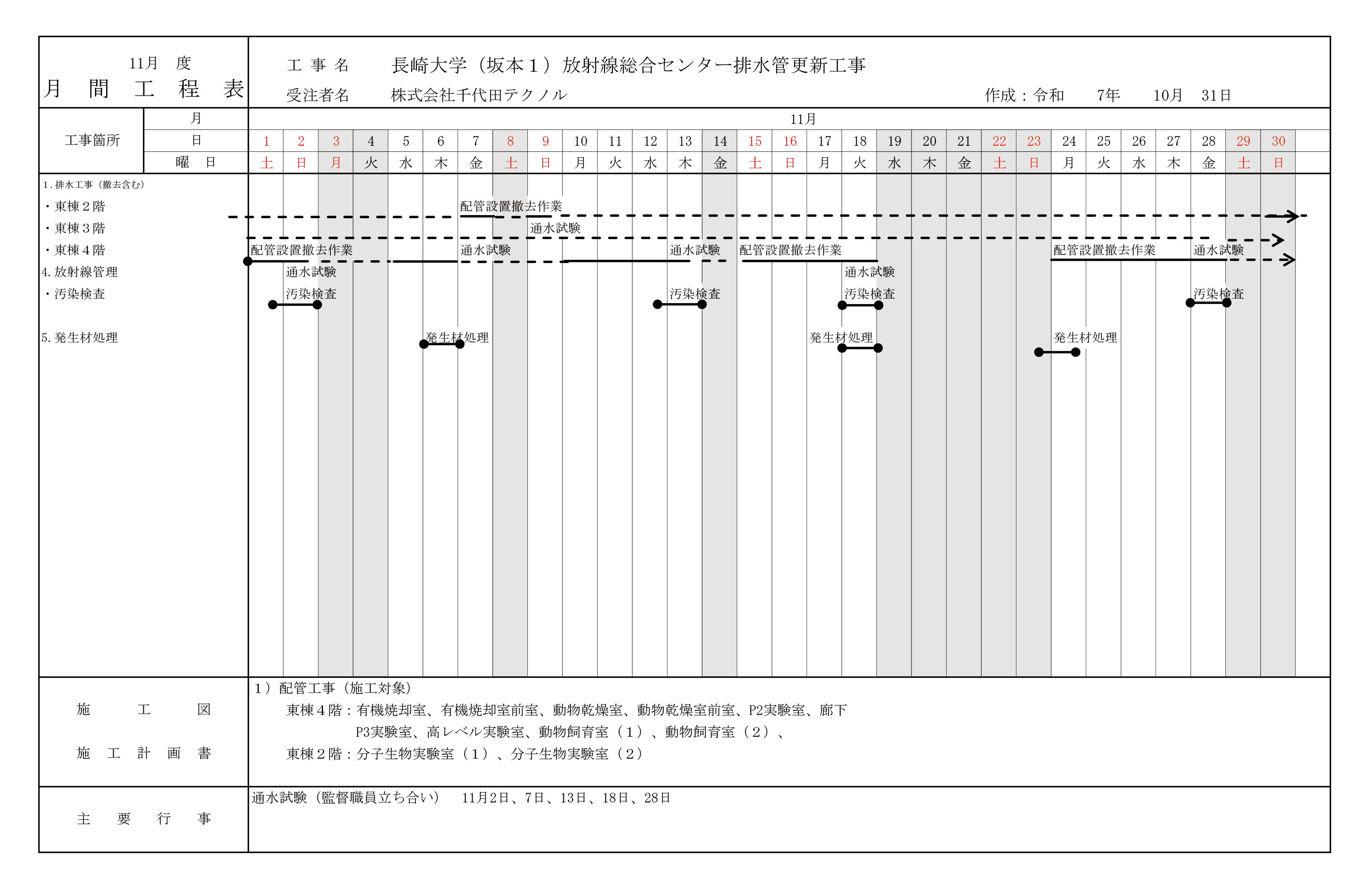 当施設の排水管更新工事においてご迷惑をおかけしております。11月の工事日程のご案内です。